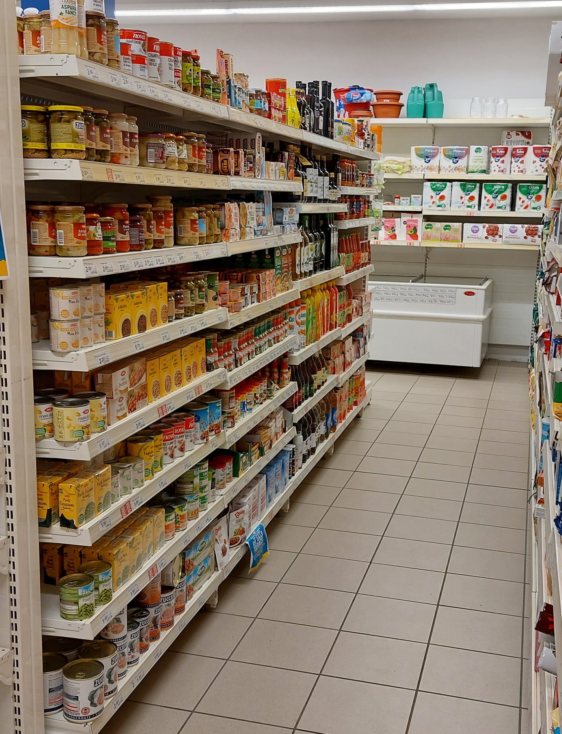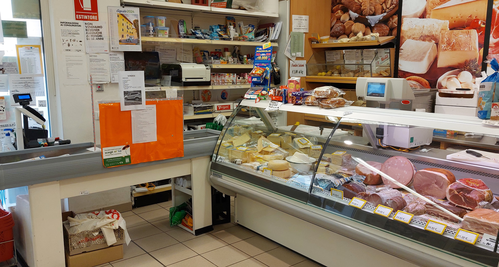 Piccolo negozio di vicinato di 84 mq con banco salumi-formaggi-pane e reparto ortofrutta.