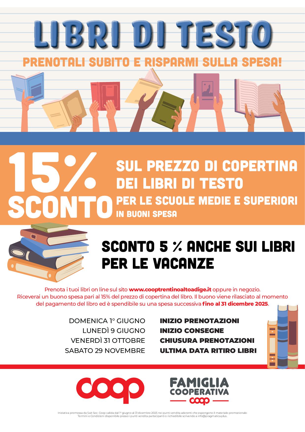 Sui libri scolastici nei negozi della Cooperazione di Consumo Trentina sconto del 15% sul prezzo di copertina.